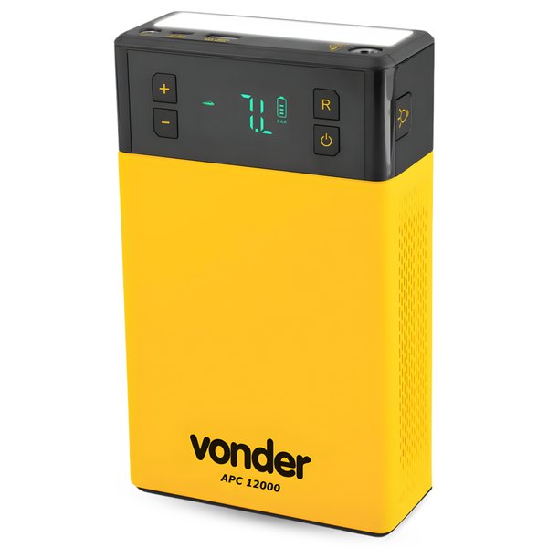 O Auxiliar de Partida Portátil APC 12000 Vonder é a solução definitiva para emergências automotivas. Com uma bateria interna de alta performance (LiFePO4), ele combina potência de partida, compressor de ar, lanterna e carregador portátil em um único dispositivo compacto.